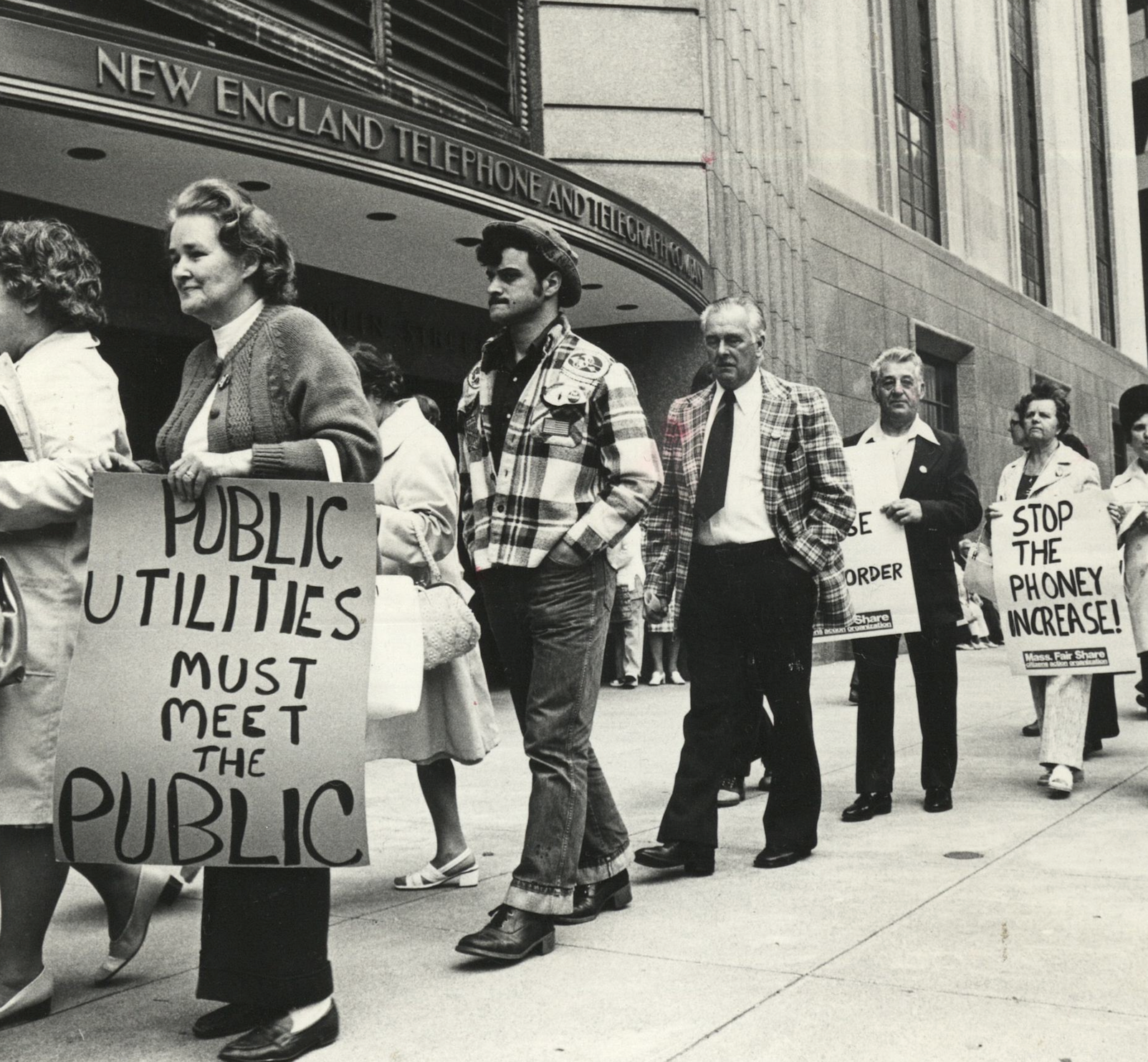 Mass Fair Share members picketing, 1978. Courtesy of University Archives and Collections, Joseph P. Healey Library, University of Massachusetts, Boston: Ann Raszmann Brown Community Organizations Photographs.